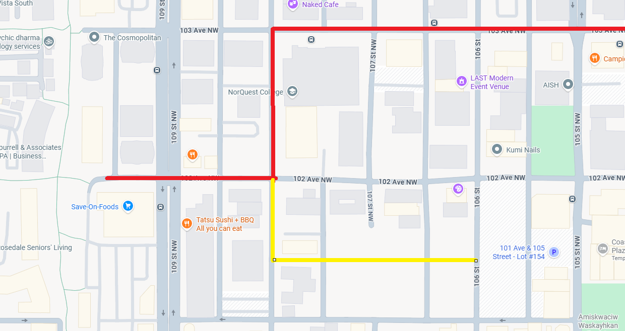As part of the Valley Line West LRT construction, Marigold has detoured 102 Ave to 103 Ave between 1...